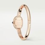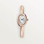 Baignoire de Cartier watch, miniature model, size 16, quartz movement. Case in pink gold. Pink gold ball-shaped crown set with 1 sapphire cabochon. Pink gold rigid bracelet. Silver-plated dial, sword-shaped blued steel hands, synthetic sapphire crystal. Length: 24.6 mm, width: 18.7 mm, thickness: 7.2 mm. Water-resistant to 3 bar (approx. 30 metres).