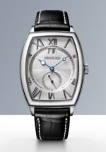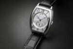 The curved silver-plated gold dial echoes the graceful lines of the case sides. The delicate guilloche pattern creates a richness and relief that emphasizes the watch’s displays and makes them easy to read. A large Roman numeral index ring with luminescent coating surrounds the minute track, while a small seconds counter at 6 o’clock completes the dial.