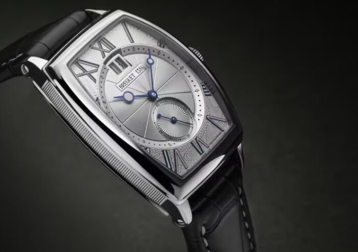 The curved silver-plated gold dial echoes the graceful lines of the case sides. The delicate guilloche pattern creates a richness and relief that emphasizes the watch’s displays and makes them easy to read. A large Roman numeral index ring with luminescent coating surrounds the minute track, while a small seconds counter at 6 o’clock completes the dial.