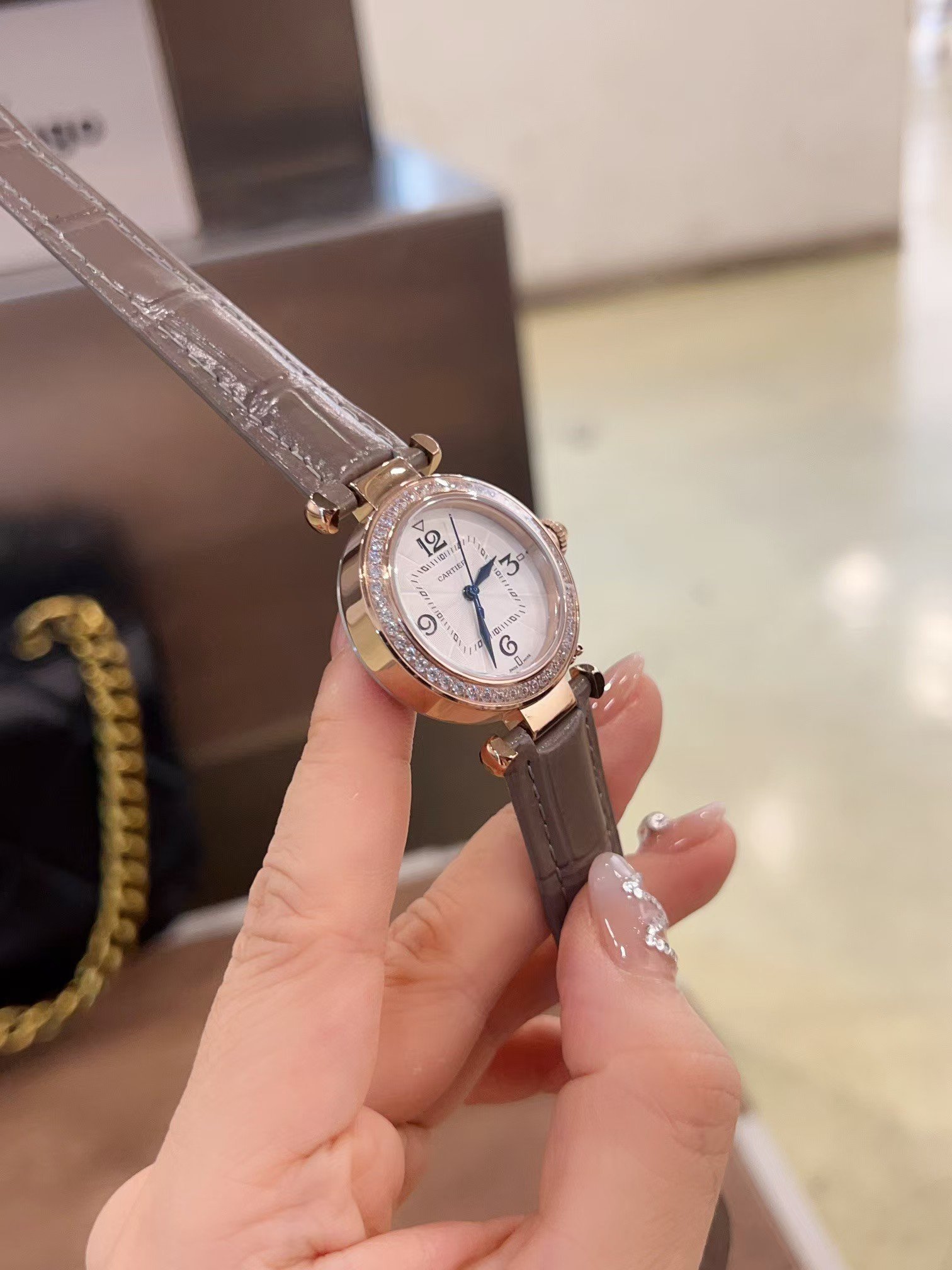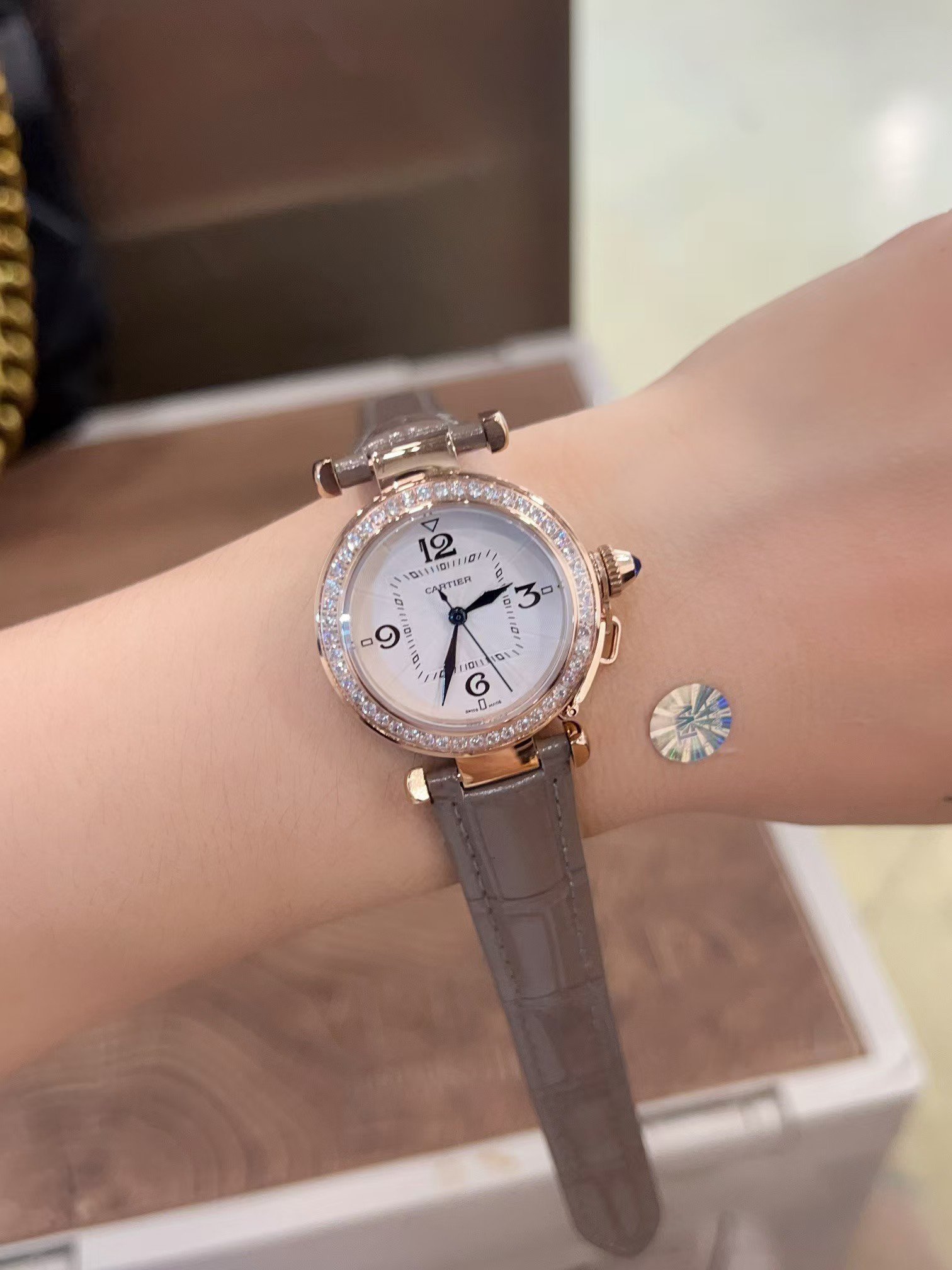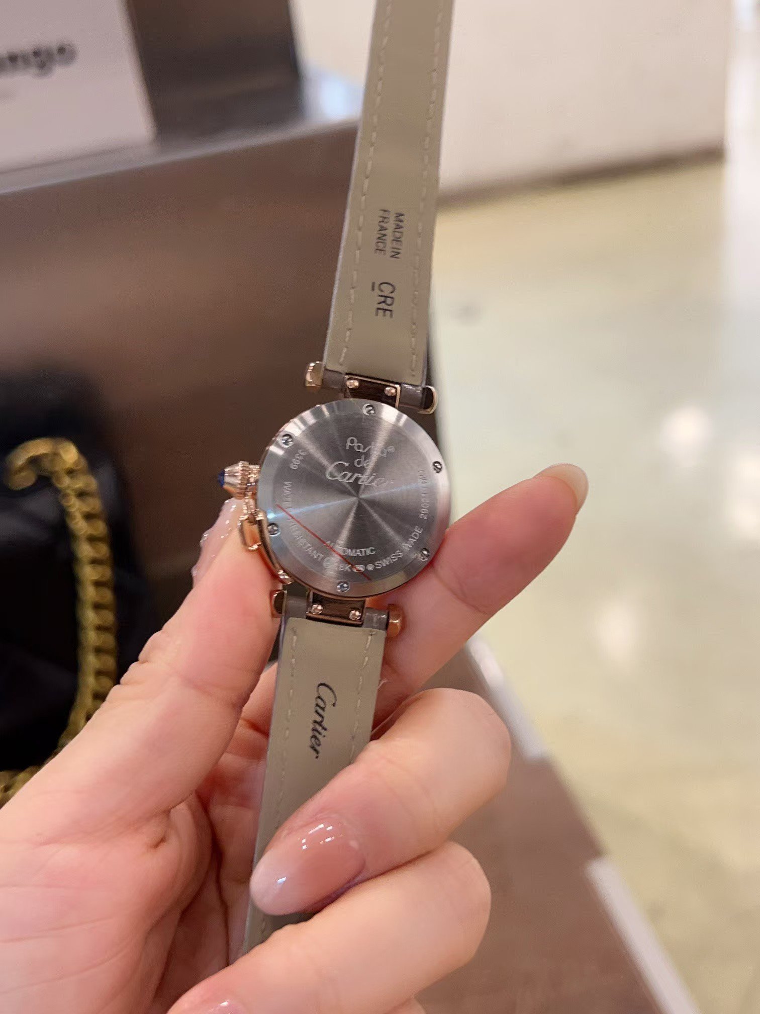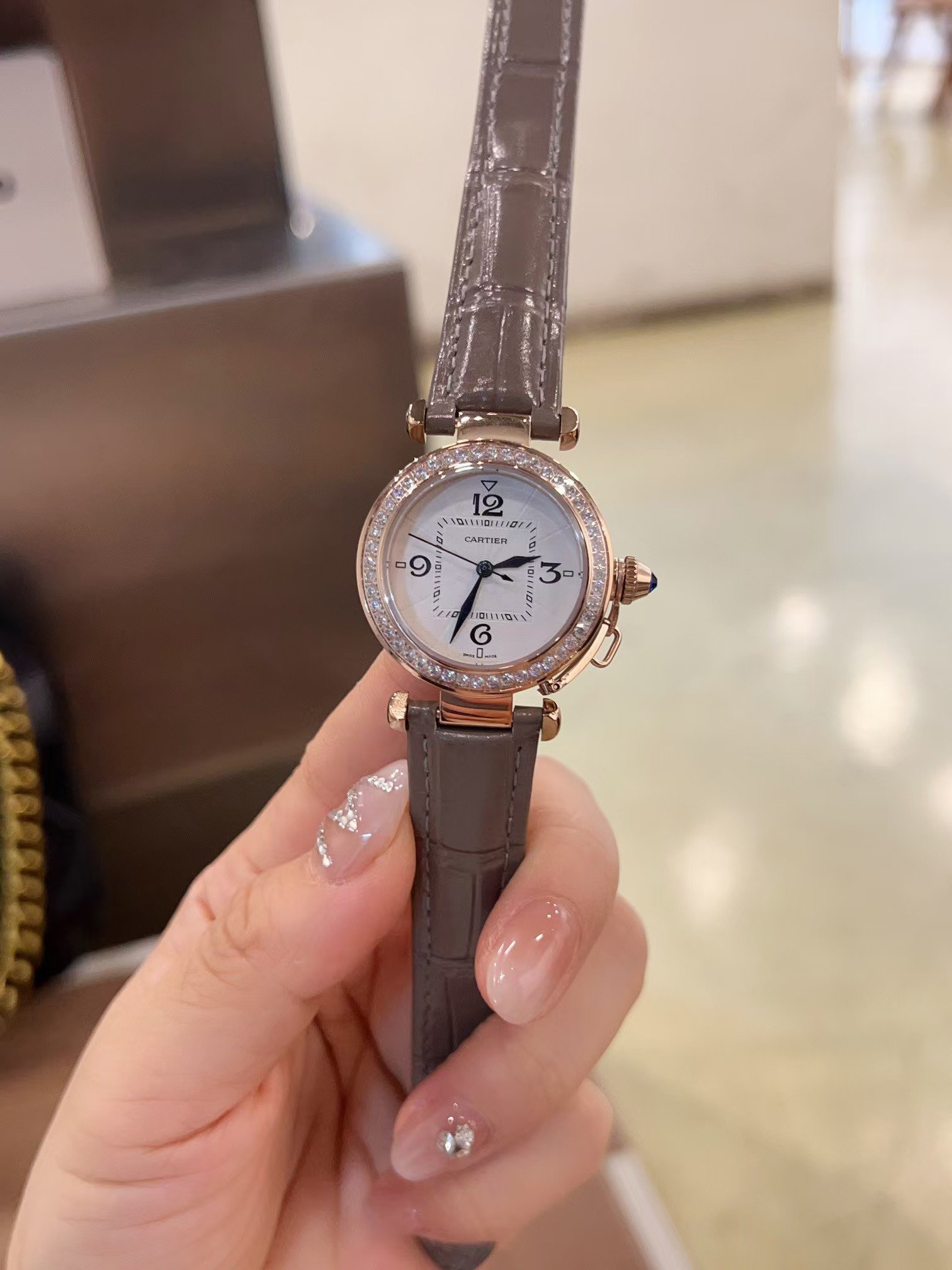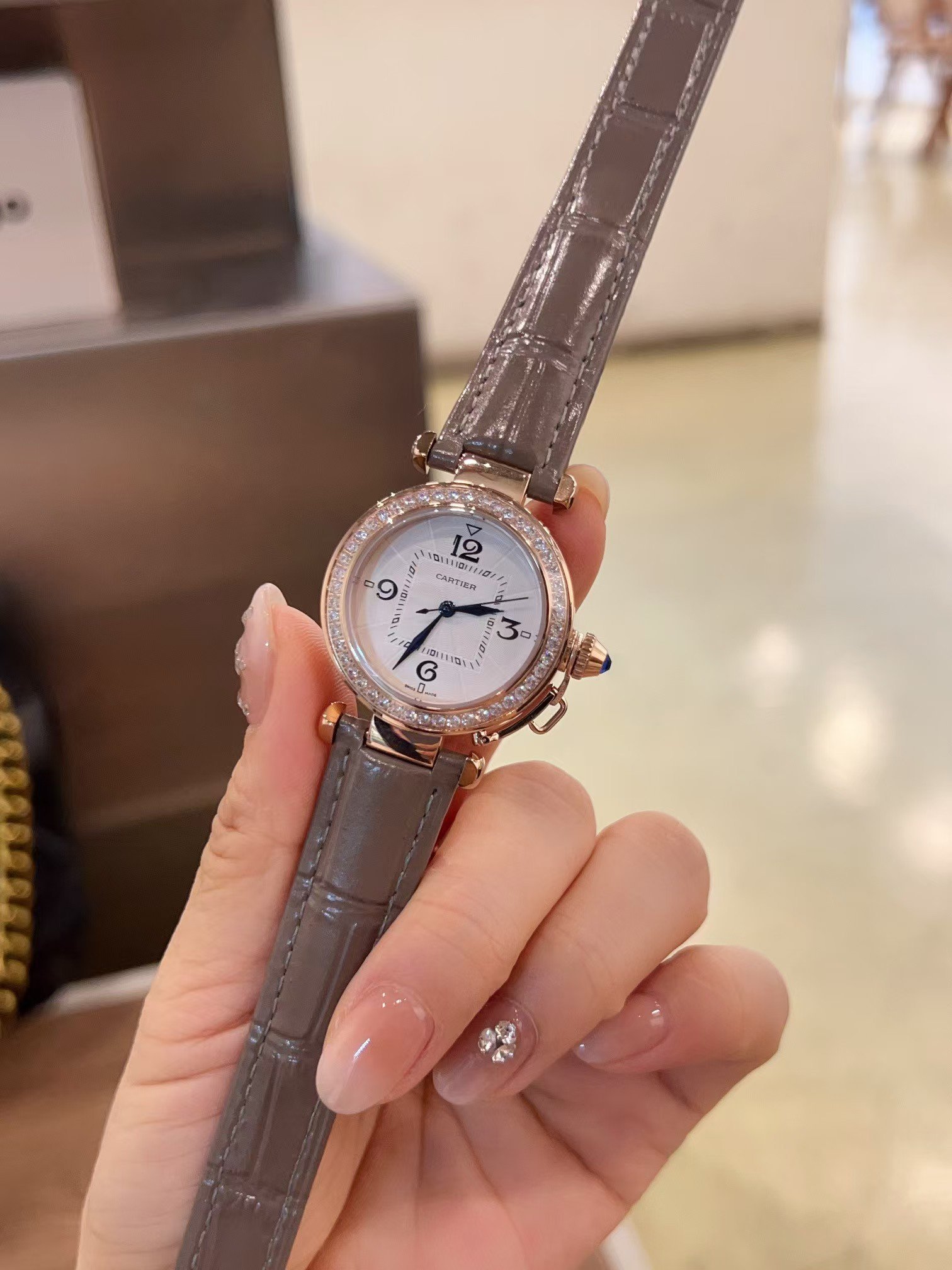 Cartier Pasha, Square in the Round, 35mm model Imported Swiss quartz movement, 316L stainless steel case, Italian calfskin strap, hardened steel blue luminescent hands, perfect for every woman