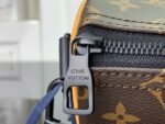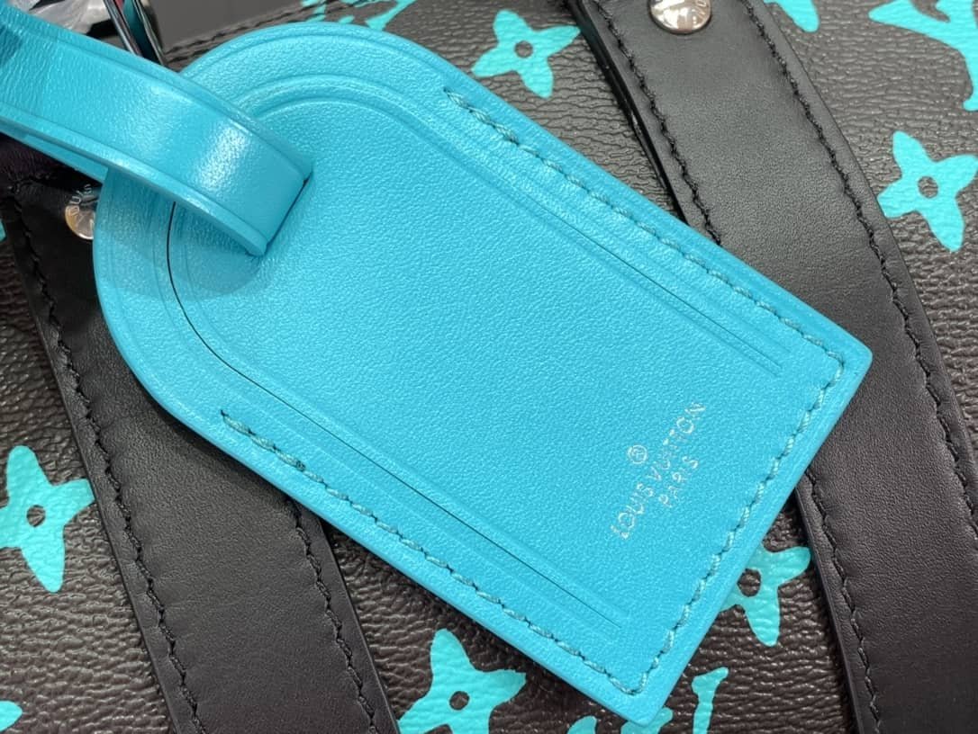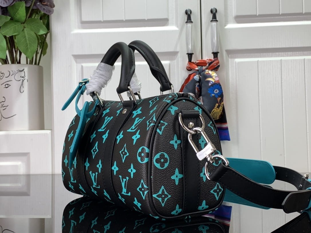 The compact Keepall Bandoulière 25 bag is fashioned from Monogram Macassar coated canvas with side bands in a lively. The hardware, including the rivets just below the handle mounts, is a matte black. A wide textile strap, with a woven tone-on-tone ‘Louis Vuitton’ pattern, enables shoulder and cross-body carry.