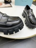 PRADA Spring/Summer 2021 upgraded triangle standard loafer slippers compared to last year’s old loafer shoes. this triangle standard has been changed to silver along the position to increase the gear print design to feel more elegant and fashionable! Thick bottom design on the foot can increase a lot of oh!