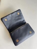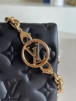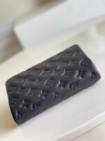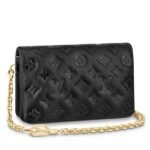 Louis Vuitton LV Black Coussin Pochette Bag M80742 BLV703. The Pochette Coussin is crafted from soft lambskin. which is embossed with the Monogram pattern to create a puffy. cushiony effect. This is further enhanced by the construction of the pouch. which gives it a supple. body-friendly shape. The removable chain. decorated with a Louis Vuitton charm. offers different carry options: clutch. shoulder or belt.