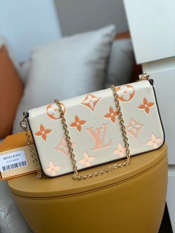 Louis Vuitton LV Felicie Pochette By The Pool M80498 BLV526. This special edition of the F??licie Pochette is part of the Summer 2021 By The Pool capsule collection. including ready-to-wear. leather goods and accessories. It is crafted from supple. grained Monogram Empreinte leather with a subtle color gradation on the embossed Monogram pattern. This chic. versatile pouch features a removable chain and two removable pockets.
