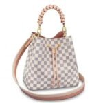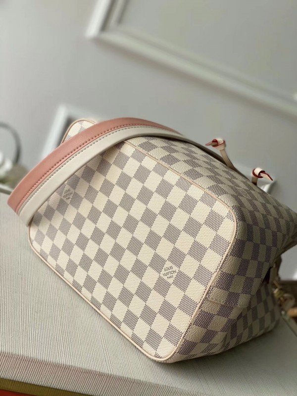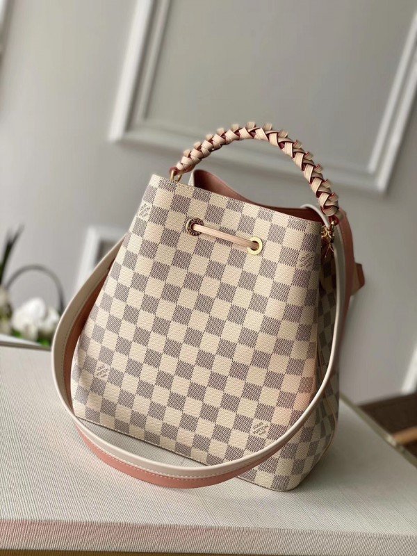 Louis Vuitton LV NeoNoe MM With Braided Handle Damier Azur N40344 BLV048. For Summer 2020. the N??oNo?? bucket bag in Damier Azur canvas features a braided-leather top handle. The hand-painted edge-dyeing of the top-handle leather is a gauge of the House??s commitment to craftsmanship. It can be hand-carried or worn over the shoulder and cross-body. with its bicolor. removable leather strap.