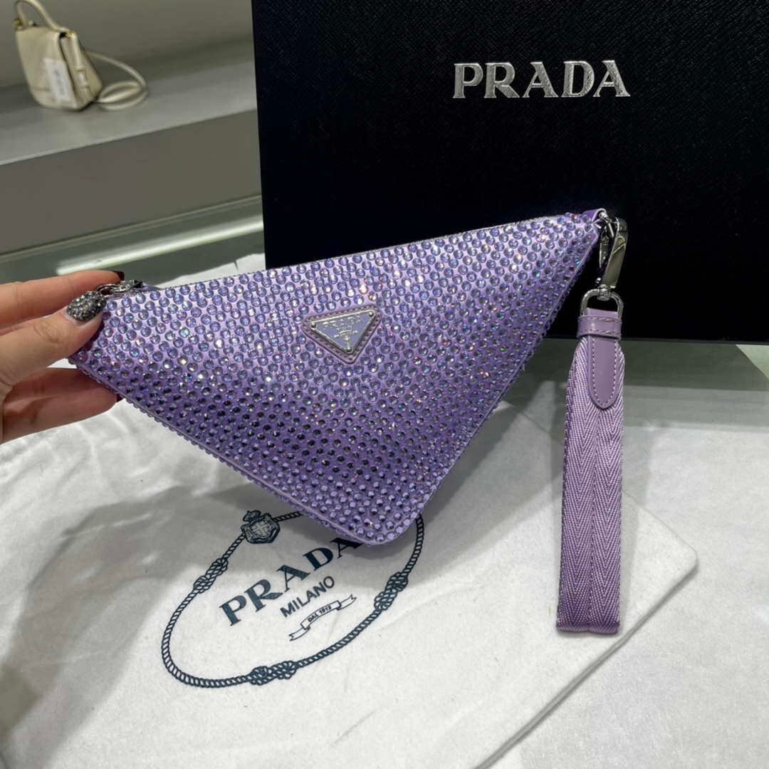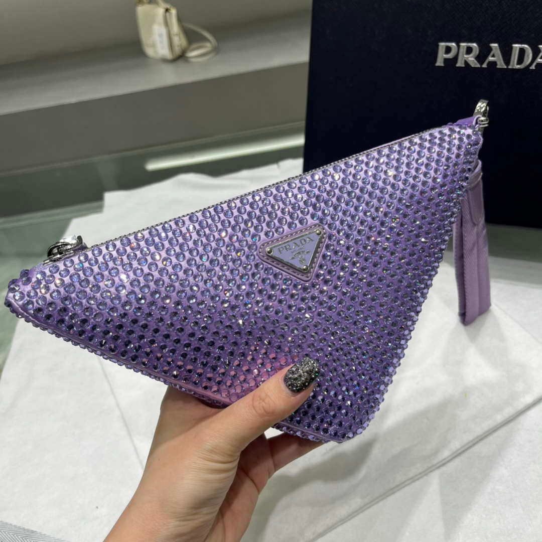 Prada 1NE039 Crystal-studded satin pouch Purple on sale now.