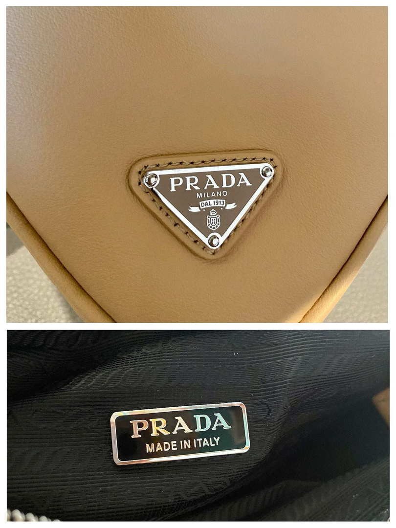 Prada 1NQ043 Triangle leather pouch Apricot on sale now.