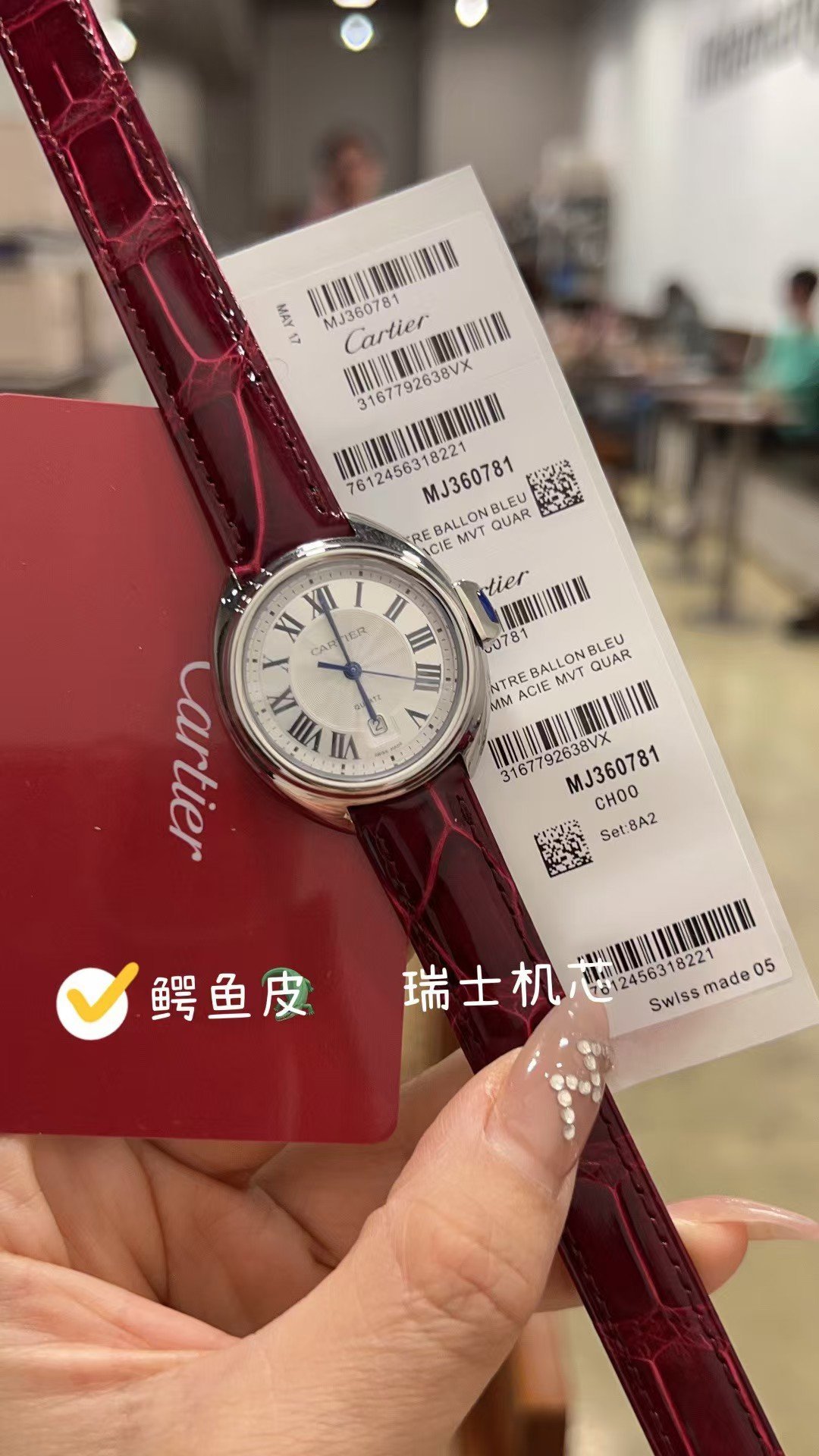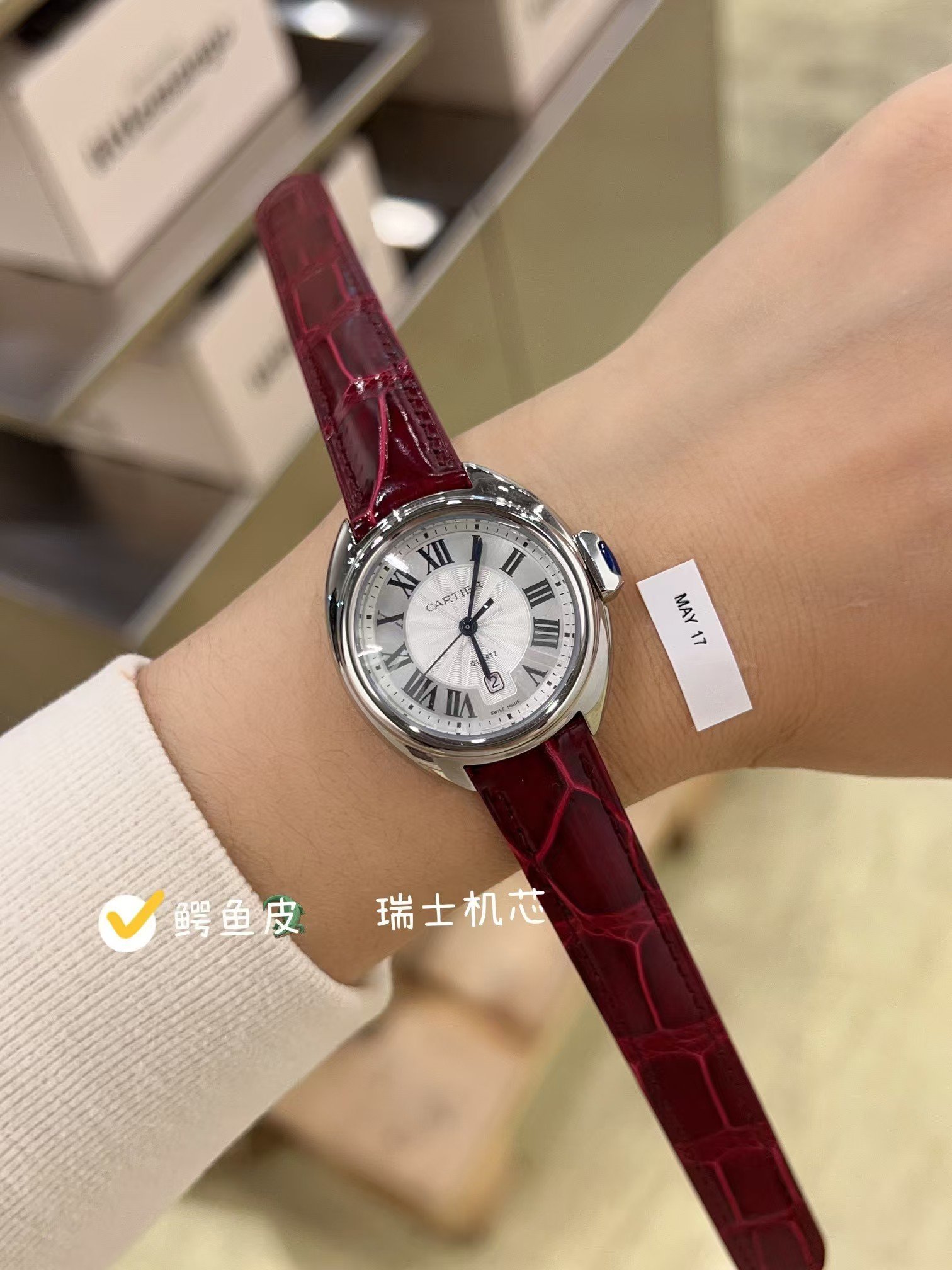 The small 31mm key watch retains Cartier’s classic design: Arabic numerals and sword-shaped blued steel hands, shaped like a key to the top of the crown inlaid with a bluestone, carved genuine dial with a sunburst pattern, 6 o’clock position for the date display window, the watch with alligator strap, imported original quartz movement, all stainless steel case, the classic design is very recognizable and suitable for any occasion to wear, it is a Cost-effective watch