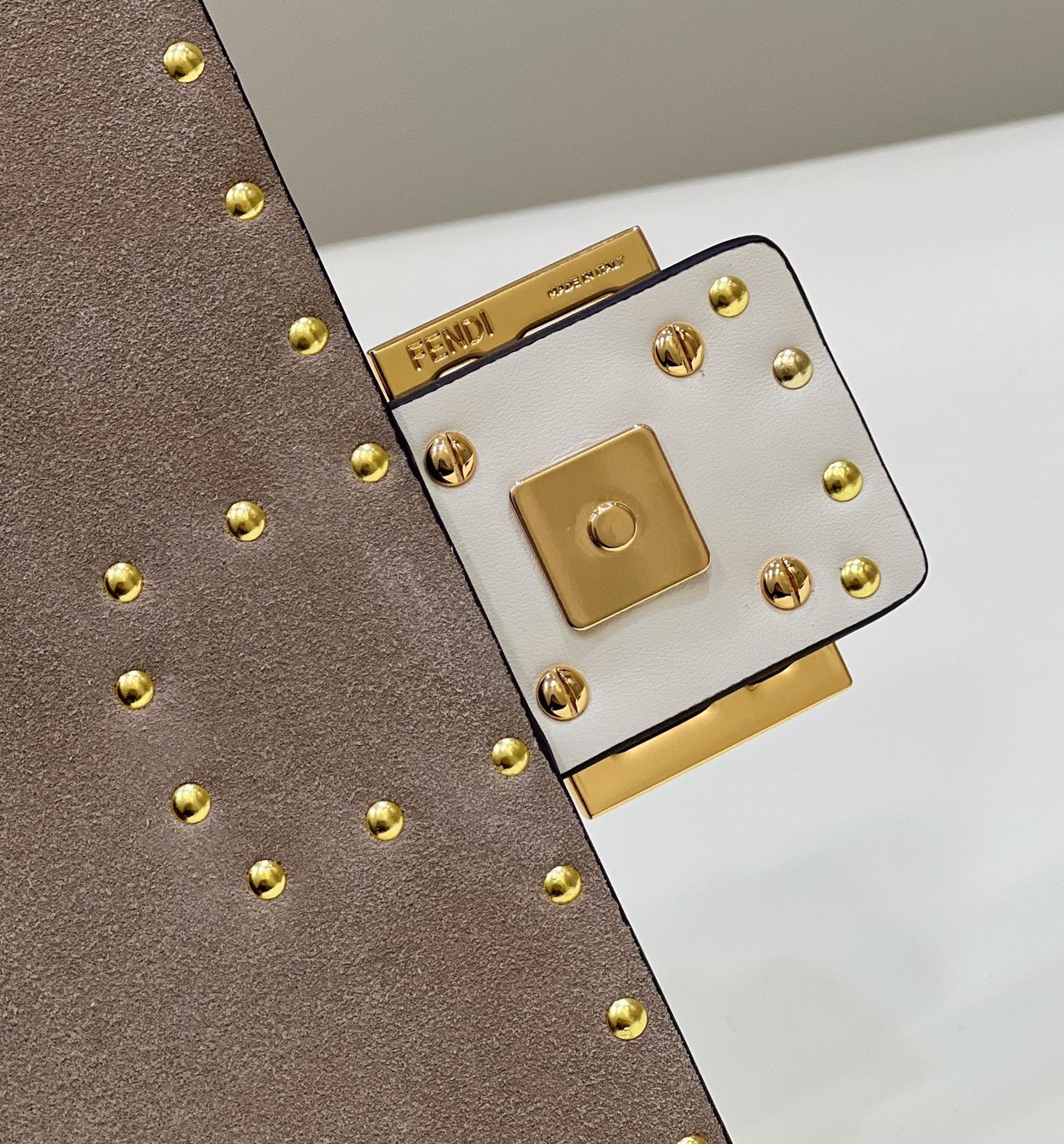 Iconic medium Baguette bag in parchment-coloured leather with Metal Stitch stitching. Decorated with an FF clasp.