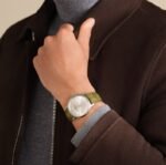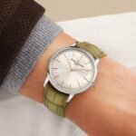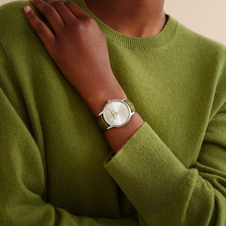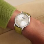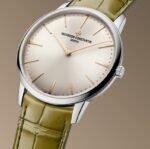 This 18K white gold timepiece is a classic of pure style and watchmaking savoir-faire. The hour-markers and hands, inspired by 1950s design, complement the subtle lines of the dial. The new olive green strap adds a fresh touch of contemporary aesthetics to this timepiece. The ultra-thin case is only 7.7 mm thick and features a sturdy caseback that can be personalized and engraved to the owner’s liking.